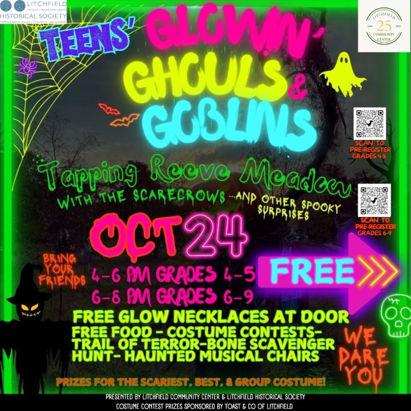 Join us on October 24th from 6:00 PM to 8:00 PM for an epic Halloween finale like no other! In collaboration with the Litchfield Historical Society, we’re throwing a spooktacular bash in the scarecrow fields at the Tapping Reeve Meadow.
