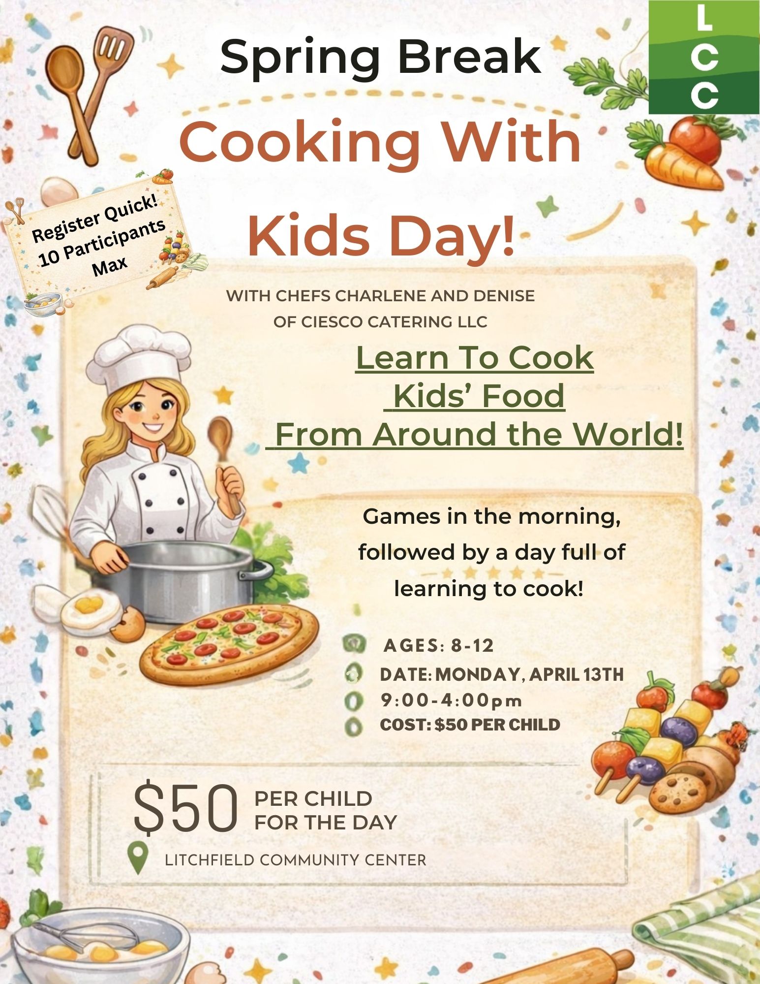 Join us at the Litchfield Community Center for a fun and delicious Spring Break experience! Our Cooking With Kids Day is designed for children ages 8–12 who love food, creativity, and hands-on fun.